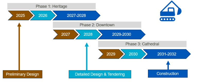Since being approved by City Council on July 9, 2023, the Project is scheduled to move forward in three design and construction phases: